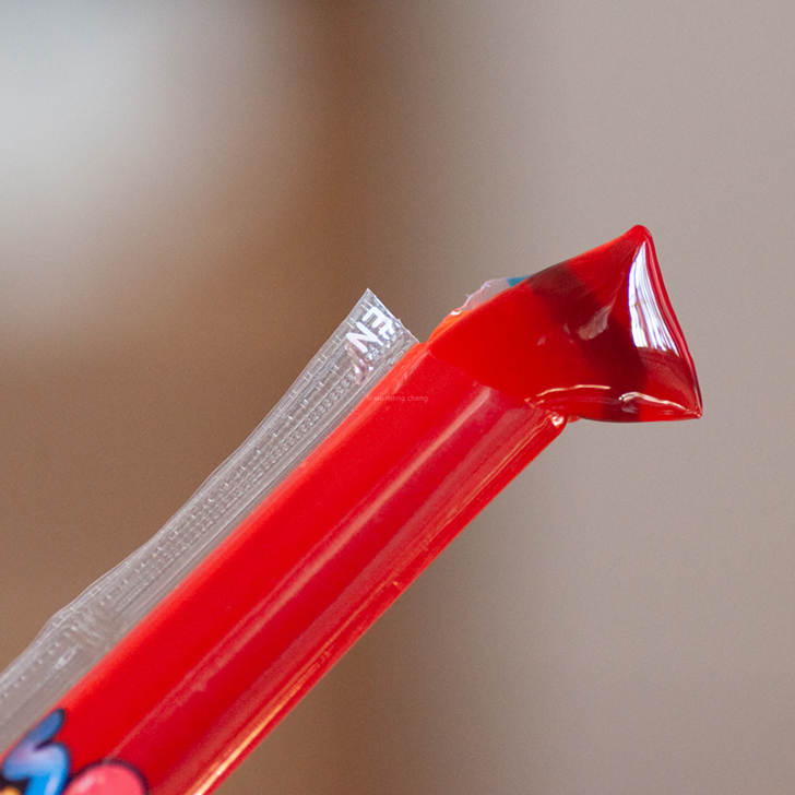 果凍變成這樣細細一條,得用牙齒咬開包裝,擠出來吸著吃。吃的不是果汁、是回憶。