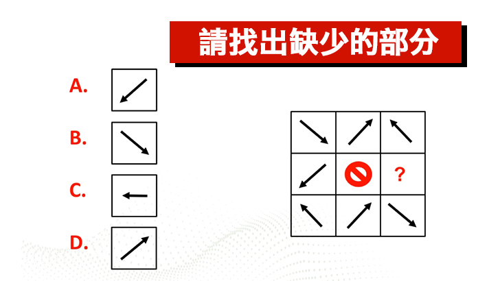 這道題目的邏輯在於所有箭頭都遵循特定的先後順序,且無論橫向或縱向觀察規律皆能成立。每個箭頭皆精準指向格子的角落,並依照「逆時針方向」依序旋轉變動。因此,缺失的部分必須填入一個符合旋轉序列、並指向下一個正確角落的箭頭,經過邏輯推算得出正確答案為 (A)。