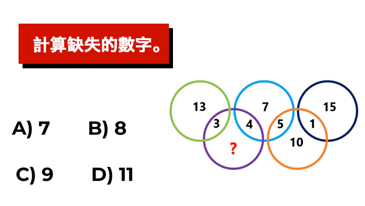 這道題考驗的是大腦的「邏輯穩定度」。畫面中共有五個彼此交疊的圓圈,每個圓圈內都包含不同的數字,但它們共同遵循一個固定的黃金定律:每個圓圈內所有數字相加後,總和都必須等於 16。為了驗證這一點,可以逐一檢視各個圓圈:綠色圓圈中的 13 與 3 相加等於 16;藍色圓圈中的 7、4 與 5 相加後同樣為 16;深藍色圓圈中的 15 與 1 相加為 16;橘色圓圈中的 5、10 與 1 相加後仍然是 16。最後來看紫色圓圈,其中包含 3、4 與一個未知數,依照相同規律可得 16 −(3 + 4)=9,因此問號所代表的正確數字是 9。