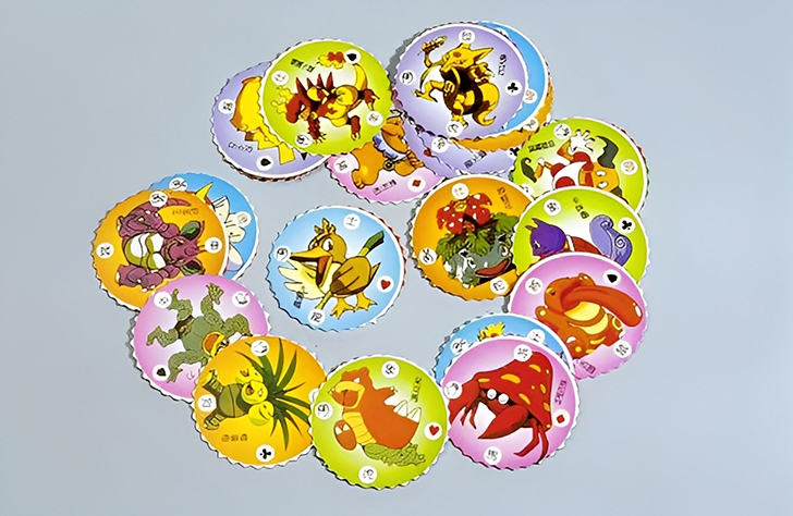 圓形紙牌,邊緣呈鋸齒狀,正面多印有當年流行的動畫或影劇圖案。玩法多樣,常透過拍、搧、翻來比輸贏,是台灣巷口最具代表性的童年遊戲之一。
