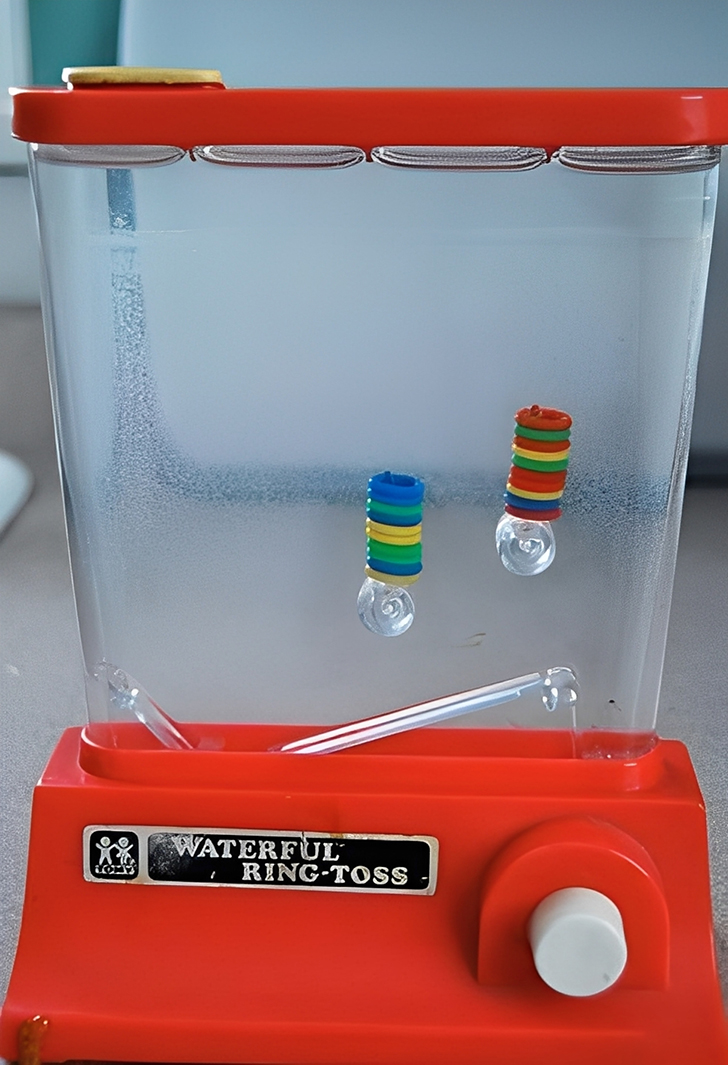 透明塑膠機身,內部裝滿水與彩色小圓圈。透過按壓兩側按鈕改變水流,嘗試將圓圈套入小柱子上。免插電、免電池,曾是 80~90 年代高 CP 值童玩代表。