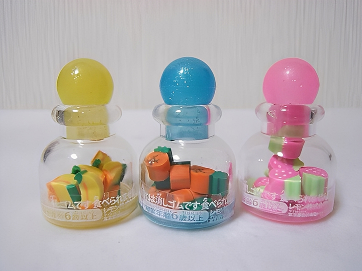 造型精緻、顏色繽紛的小型橡皮擦。雖然實際「不好擦」,卻因為太可愛而捨不得用,成為鉛筆盒裡純收藏用途的童年必備品。
