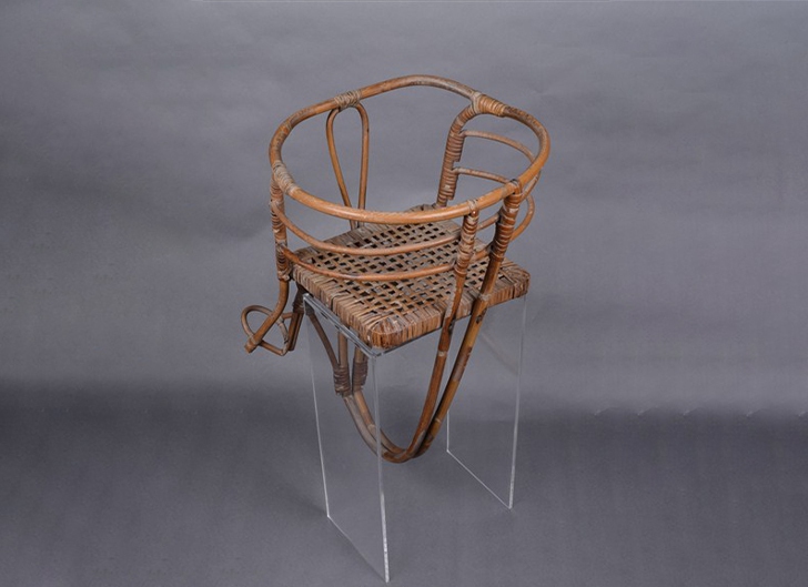 老式竹藤製腳踏車幼兒座椅是早期臺灣用於載運幼兒的腳踏車附座,結構巧妙且材質自然。骨架以藤條製成,椅面則由竹篾編織而成,採用「壓一挑一四角孔編」技法,孔隙頗大,有良好的透氣性。椅面四周以木條框住,再以竹篾來回纏繞固定,增加結構穩定性。座椅椅面上設有兩道圈背:上圈由兩支藤條曲折連接成橢圓形,兼具靠背與手扶功能,手扶部分略為上翹;下圈藤條則提供靠背與整體穩定性。上下圈之間的椅背,也以竹篾編織而成,增加舒適度與透氣效果。椅面前方上部有藤條彎曲成180度的構件,不僅加強結構,亦可分開幼兒雙腿;下方前端還設有三角形腳踏架。椅面後方從圈背延伸出兩道勾弧形長藤條,用以支撐與固定整體結構。所有接合處以竹篾或鐵釘固定,使座椅既牢固又耐用。這種座椅不僅安全舒適,也是早期臺灣親子交通生活的一個縮影,展現出傳統工藝與育兒智慧的結合。